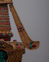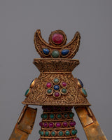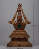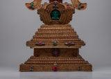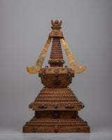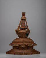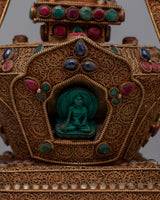 This stupa, embellished with original Turquoise, ruby, Coral, panna, and lapis lazuli stones, is visually magnificent and full of symbolic value. Each stone is meticulously inlaid to complement the overall design, offering a touch of elegance and a pop of color that draws attention. These actual stones give the stupa a sense of authenticity and reverence, making it an ideal centerpiece for your home, meditation room, or altar.