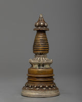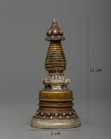 Discover about the Handcrafted Kadampa Buddha Stupa, a magnificent sculpture that was carefully made of oxidized Copper and exquisitely silver-plated. Standing 11 cm tall, this stupa has the characteristic architectural features associated with Kadampa Buddhism. The stupa's elaborate the details is enhanced by the rich, textured base that the copper's oxidation has given it. This contrasts well with the dazzling silver plating.