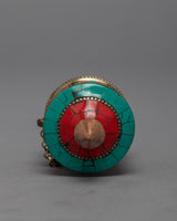 Our exquisitely handcrafted prayer wheel has delicate precious stone carvings that give it a traditional and opulent appearance. Our gifted artisans carefully make each prayer wheel so that it exudes a sense of spiritual connectedness and peace. Spin the wheel while saying your mantras and prayers to invite divine blessings into your environment with its uplifting energy.