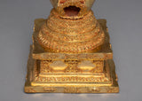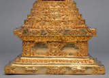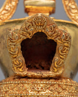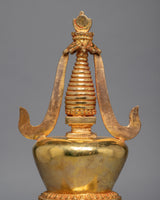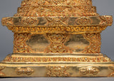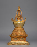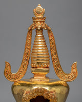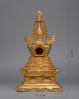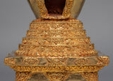 This beautifully crafted Stupa is a true masterpiece. It has been expertly handcrafted with a Copper body and then plated with 24k gold to give it a regal look. The stupa stands tall with four steps, each step adorned with intricate designs that are a true testament to the skill of the craftsmen who created it. This Stupa is not only a work of art but also holds deep spiritual significance for those who practice Buddhism. It is said that by meditating and offering prayers near a Stupa, one can generate positive energy and overcome negative influences. This Stupa is a perfect addition to any spiritual practice or as a centerpiece in a peaceful home environment.