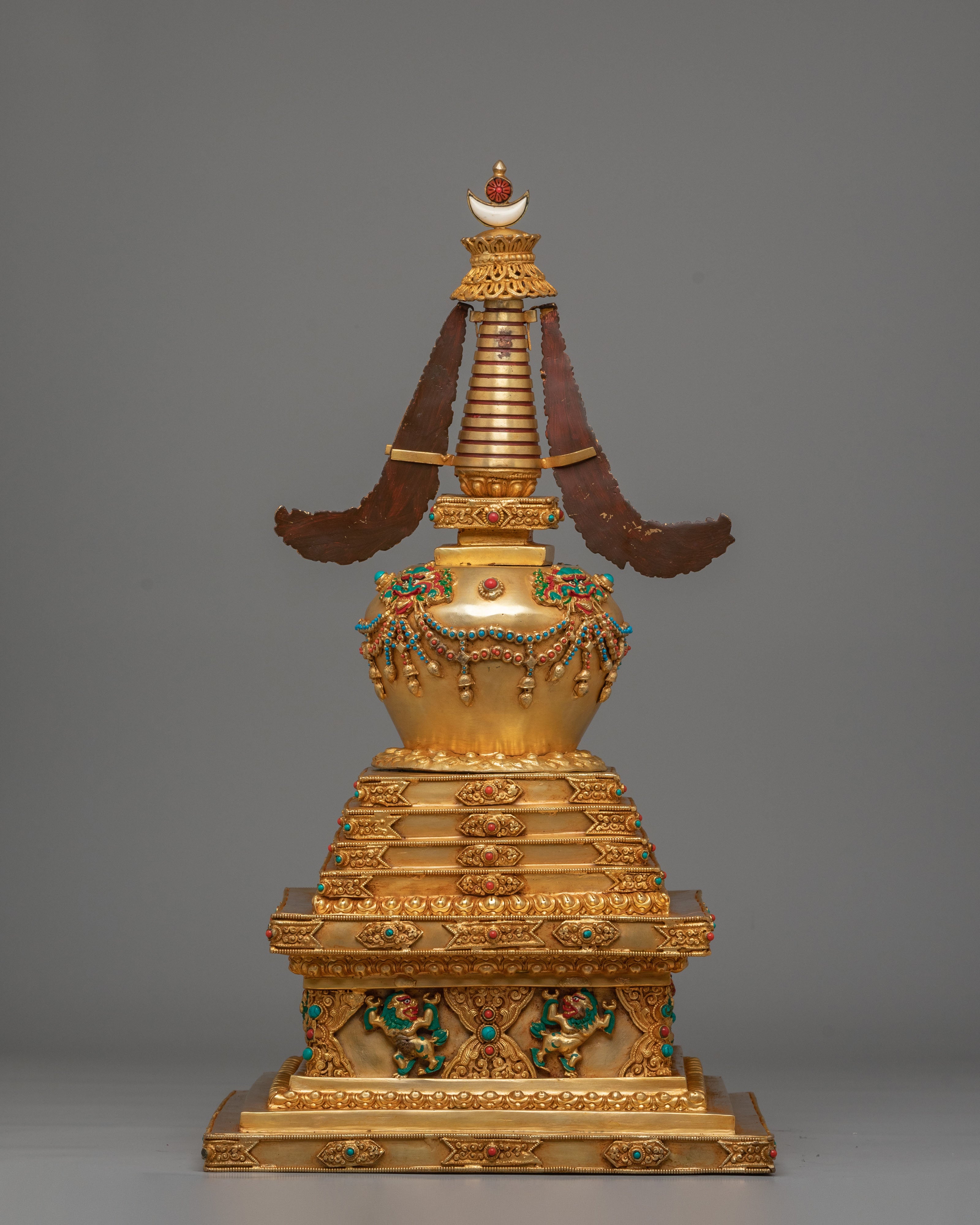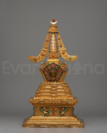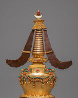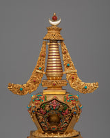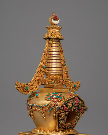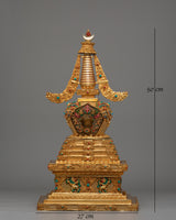 The stupa features a refined blend of materials, with a copper body providing a solid foundation, then enhanced with electro-gold plating for a luxurious, radiant finish. The acrylic colors and gemstones are strategically placed to improve the stupa's visual appeal and increase its spiritual potency. The coral and turquoise stones are believed to bring positive energy, protection, and clarity to the space, while also enhancing the practitioner’s spiritual growth. This sacred design represents the union of wisdom and compassion, which is at the core of Buddhist teachings.