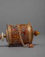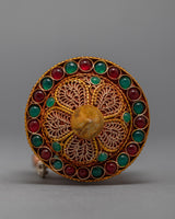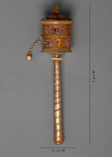 The Handcrafted Prayer Wheel with Gold Plating and Gemstones is a stunning and unique Buddhist practice and meditation tool. The cylinder of the prayer wheel is handcrafted and features the mantra, which is beautifully crafted in gold plating. The addition of precious gemstones to the cylinder adds an extra touch of elegance and beauty, making it a true work of art. The handle of the prayer wheel is made from copper, adding a warm and inviting feel to the piece. The combination of gold plating, gemstones, and copper makes this prayer wheel a truly unique and special piece. The handcrafted nature of the prayer wheel means that each is unique, and no two are exactly alike.