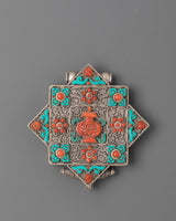 This Kalash Ghau Box Locket is a stunning handcrafted Tibetan pendant that mixes the Kalash's sacred symbolism with the strength of coral and turquoise stones. This locket is composed of silver and measures 10.5cm in height and 10.5cm in width, weighing 0.13kg. It offers both durability and elegance, while also possessing deep spiritual value. The Kalash is usually connected with prosperity, purity, and the presence of divine favor. This locket embodies these attributes, bestowing prosperity, protection, and spiritual support upon the owner.