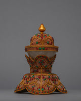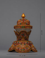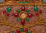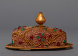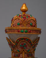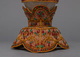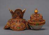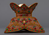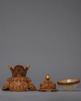 The Kapala is a magnificent work of art that has been carefully handcrafted on a copper body with intricate designs and patterns. The Kapala is then 24K gold plated, adding to its beauty and symbolism by giving it a luxurious and extravagant appearance. The gemstones on the set are embellished, adding to their elegance and spiritual significance. In Buddhist and Hindu traditions, the Kapala is a powerful and sacred object that is frequently used in ritual practices and ceremonies. It is a transformational symbol that represents the transformation of negative energy into positive energy.