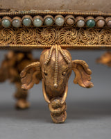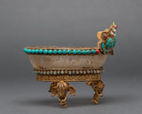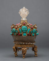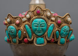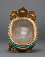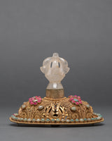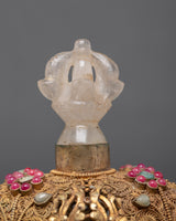 Our kapala is elegantly hand-carved and plated with 24K Gold Plated. At the top, the half vajra is full of crystals. Likewise, flowers are carved in the kapala, meaning renewal and spirit, and spiral, a symbol of the movement, the renewed zeal of life through spiritual contact, and the subconscious healing energies of your inner self, respectively.