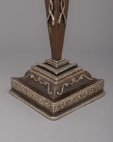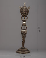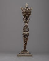 Delve into the enigmatic world of the Handcrafted Kila Phurba, a sacred object of deep spiritual significance, masterfully crafted on a copper body. This ethereal dagger, symbolizing the subjugation of negativity, is adorned with a captivating silver plating, exuding an aura of divine purity and power. With a height of 40 cm, it stands tall, firmly rooted in its sacred purpose. The Kila Phurba comes complete with an elegant stand, allowing it to grace your sacred space with its mystical presence.