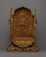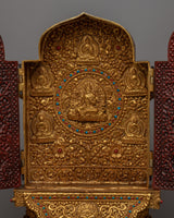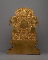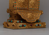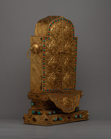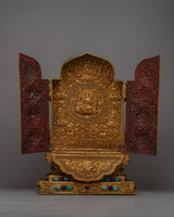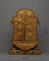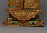 View this magnificent Large Gau Tibetan Buddhist Prayer Box, a work of divine craftsmanship. With a 45cm height and a lavish copper body lavishly plated in 24k gold, it exudes the height and majesty of spiritual grandeur.