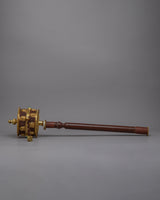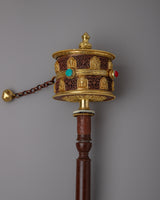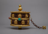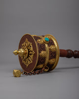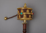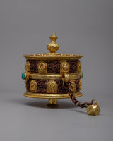 The Large Prayer Wheel embodies majesty and spirituality. This magnificent prayer wheel is adorned with 24k gold plating, an intricate copper body, and gemstones meticulously inlaid into its design.