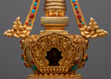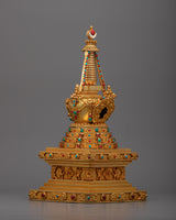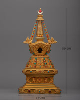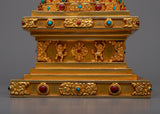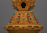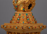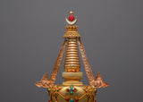 This 24k Gold-Plated Stupa is ideal for creating a serene and contemplative environment in meditation spaces, or spiritual centers, or as a standout piece in a religious artifact collection. It's more than just an enlightenment symbol; it's a work of art that represents both the spiritual journey and the beauty of artisanal craftsmanship. This stupa is a luxurious addition that elevates the aesthetic and spiritual ambiance of any setting.