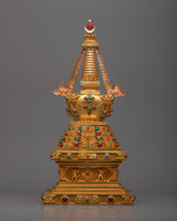 Copper as the base material ensures the stupa's structural integrity and longevity, while 24k Gold Plating gives it a sacred glow. This combination not only heightens the stupa's ceremonial significance but also adds a touch of opulence. The handcrafting process ensures that every detail, from the dome to the spire, is expertly crafted, capturing the essence of traditional Buddhist art.