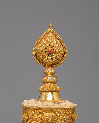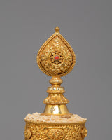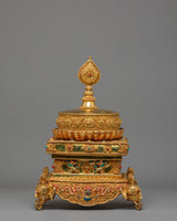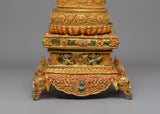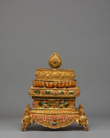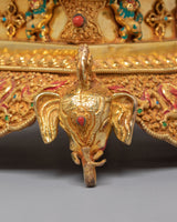 This Mandala for Sacred Ceremonies is a meticulously crafted ritual object made of copper and finished in fire-gilded copper. It stands 49cm tall and 27cm wide, weighs a substantial 4.02kg, and is an eye-catching centerpiece for any altar or ceremonial setting. This mandala, adorned with coral and turquoise stones, conveys deep traditional symbolism while adding to the visual richness of your spiritual surroundings.