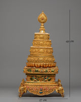 The multi-tiered structure depicts layered universes, each with elaborate designs, lotus petals, and auspicious symbols. The top finial resembles a precious diamond, representing the ultimate aim of enlightenment. The base is ornately embellished with protective deities, filigree patterns, and legendary elements that represent abundance, clarity, and divine protection. The colorful coral and turquoise stones offer sacred color associations: coral represents energy and protection, and turquoise represents spiritual balance and healing.