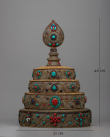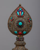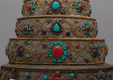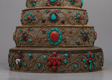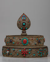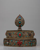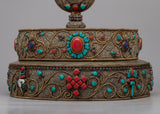 The Mandala Offering Plate, skillfully fashioned from copper, exemplifies spiritual commitment and reverence. Standing 46cm tall, it draws attention with its exquisite design and brilliant finish. It is meticulously handcrafted and displays Tibetan craftsmen' superior craftsmanship and creative history.