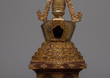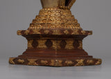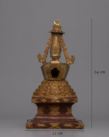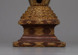 Presenting the Meditation Stupa, an exquisitely made emblem of spiritual tranquility and painstaking artistry. This stupa, which is 1.78 kg in weight and is 24 cm in height and 12 cm in width, is handcrafted from a Copper body and elegantly Gold Plated. The ancient traditions of Tibetan Buddhism, where stupas are treasured as symbols of the Buddha's enlightened mind and the path to spiritual awakening, are reflected in its exquisite design and intricate details.