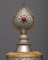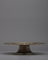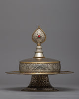 The Rice Offering Mandala Set, skillfully handcrafted on tin with beautiful floral carvings, embodies the time-honored custom of holy offerings. This set is both beautiful and purely practical, measuring 35cm in height and 25.5cm in breadth and weighing 1.47 kilograms.
