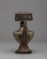 The Bhumba is a ceremonial item that contains holy water blessed by the Guru. The holy water is thought to eliminate negativity and purify people and objects. Bhumba is used for complicated purification rituals to easily purify and defend from harmful forces.