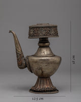 Introducing our magnificent Nepali Silver Karuwa! Crafted with precision and passion, this extraordinary piece combines the durability of copper with the enchanting allure of silver plating. The result? A stunning, eye-catching karuwa that radiates elegance and sophistication. Its sleek design and gleaming silver surface make it a true treasure to behold. Whether you use it as a decorative accent or a functional utensil, this karuwa is sure to impress with its exquisite craftsmanship and undeniable charm. Add a touch of Nepali craftsmanship and excitement to your collection with this extraordinary silver karuwa!