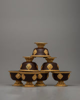 Immerse yourself in the tranquility of the Seven Offering Bowl Altar, a gentle reminder of the sanctity that surrounds us. These bowls, made with care on copper bodies and embellished with dazzling 24K gold and silver plating, are both elegant and spiritually significant. Each bowl, meticulously embellished with auspicious symbols, serves as a vessel for gratitude and blessings, beckoning you to connect with the divine in everyday life.