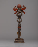 The Oxidized Copper Phurba will transport you to a world of exquisite Tibetan craftsmanship. This 26cm ritual dagger, which was hand-molded on a genuine oxidized copper body, is both profoundly symbolic and exquisitely crafted. This 0.69kg masterpiece, which features a Deity that has been painstakingly crafted at the peak and is supported by a dedicated stand, promises to be an important addition to any collection.