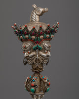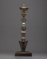 With our mesmerizing Phurba Mantra Practice Dagger, you can unleash the power of ancient rituals! This majestic phurba is a true masterpiece, meticulously handcrafted on a lustrous silver, and embellished with Coral, Irani, and Lapiz Lazuli Stones. It commands respect and attention as it stands tall at 51 cm. With the included stand, it becomes a spiritual energy focal point in your sacred space. Take advantage of its symbolic power and embark on a transformative journey of enlightenment. Accept the divine energy that flows through the Phurba Mantra Practice Dagger and expand the scope of your spiritual practice.