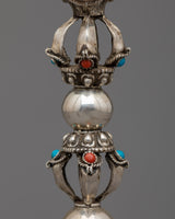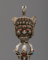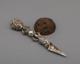The Phurba Stand with Phurba is a meticulously handcrafted piece made from copper with exquisite silver plating. It features a Phurba, a traditional ritual dagger, which is securely placed on a wooden stand. The copper body of the Phurba is intricately designed and embellished, while the silver plating adds a touch of elegance to the overall appearance. The wooden stand provides stability and enhances the display of the Phurba. This set is not only a beautiful decorative item but also holds symbolic and spiritual significance in various spiritual practices and ceremonies.