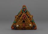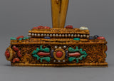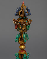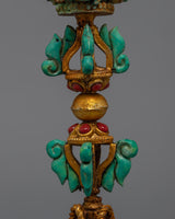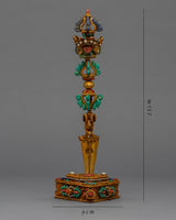The handcrafted Phurba is a unique altar item that is crafted with intricate detail and adorned with embedded gemstones. The top of the Phurba is crafted with a half Vajra, which represents the male principle of enlightenment, followed by a 3-face Vajrakilaya, a wrathful deity in Vajrayana Buddhism, and finally the Phurba itself, which represents a sacred dagger used for ritual purposes. The gemstones embedded in the Phurba add a layer of beauty and spiritual significance to the piece, with each stone selected for its unique properties and symbolic meaning. The Phurba also comes with a stand for displaying the item in a proper manner.