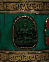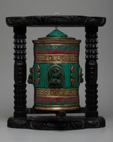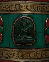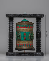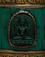 Presenting our exquisitely crafted Prayer Wheel Turner, which is made by hand. The prayer wheel itself has a brass body with beautiful inlays of coral and turquoise stone, giving it an air of spiritual significance and ageless elegance. This magnificent piece, which is housed in a wooden frame, offers an alluring fusion of artistic beauty and traditional craftsmanship.