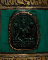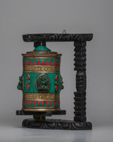 Each part of the prayer wheel is exquisitely crafted, embodying the rich tradition and symbolic meaning of Tibetan spirituality. The inlays of turquoise and coral stone offer a striking splash of color and spiritual significance, while the brass body itself represents durability and strength.