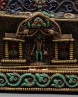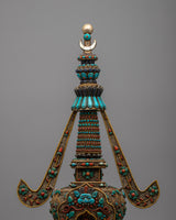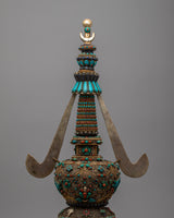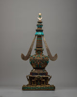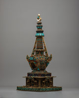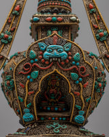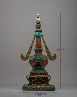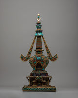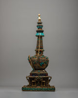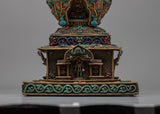 The original gemstones—Turquoise, Coral, lapis lazuli, and conch—inlaid into the stupa's structure are what distinguish it. These priceless stones have deep spiritual meaning in addition to adding vivid color and fine detail. Protective properties associated with Turquoise, life force and energy symbolized by Coral, knowledge and truth represented by lapis lazuli, and the voice of Buddha and the propagation of Dharma symbolized by conch are well-known. These components work in harmony to provide a stunning and spiritually significant focal point for meditation and devotion, which is the stupa.