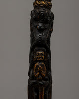 Ritual tools are vital equipment of Tibetan Vajrayana Buddhism practice, meant to dispel misconceptions obstructing enlightenment. The phurba (Sanskrit: Kila) blade seen here was created to symbolically swallow the three poisons that obstruct spiritual progress: ignorance, greed, and illusion. The Phurba is the physical manifestation of the Vajrakila Buddha, who can destroy all evil on the earth. Its ceremonial usage is first recorded in the Vajrakilaya Tantra, an eighth-century or older Vajrayana work.