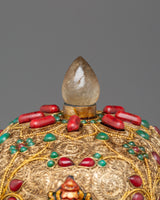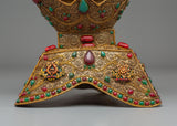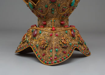 The Sacred Kapala Ritual Offering Cup is an exquisite handcrafted object intended for use in Tibetan Buddhist rituals and spiritual offerings. This sacred vase stands 34cm tall and 21.5cm wide, with a beautiful copper body embellished with filigree work that showcases the meticulous craftsmanship of traditional Tibetan arts. The Turquoise and Coral stones enrich the design by representing healing, protection, and spiritual clarity, making it an ideal addition to any altar or meditation room.