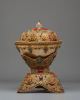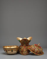 The Kapala set holds the nectar used in higher esoteric rituals. It offers liberation to gods and deities to ensure their devotion. The offerings are said to be transformed into the Wisdom Nectar, a liquid form of the deity's Enlightened Mind.