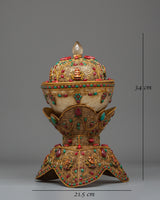 In Tibetan Buddhism, the Kapala cup is commonly used as a ritual receptacle for holding sacred offerings during ceremonies. It represents the removal of impediments and the cleansing of the psyche. Displaying the Sacred Kapala Ritual Offering Cup on your altar invites heavenly blessings, spiritual protection, and inner serenity into your practice. This vase is not only a gorgeous adornment but also a powerful spiritual tool that will improve your meditative practice and connection to the divine.