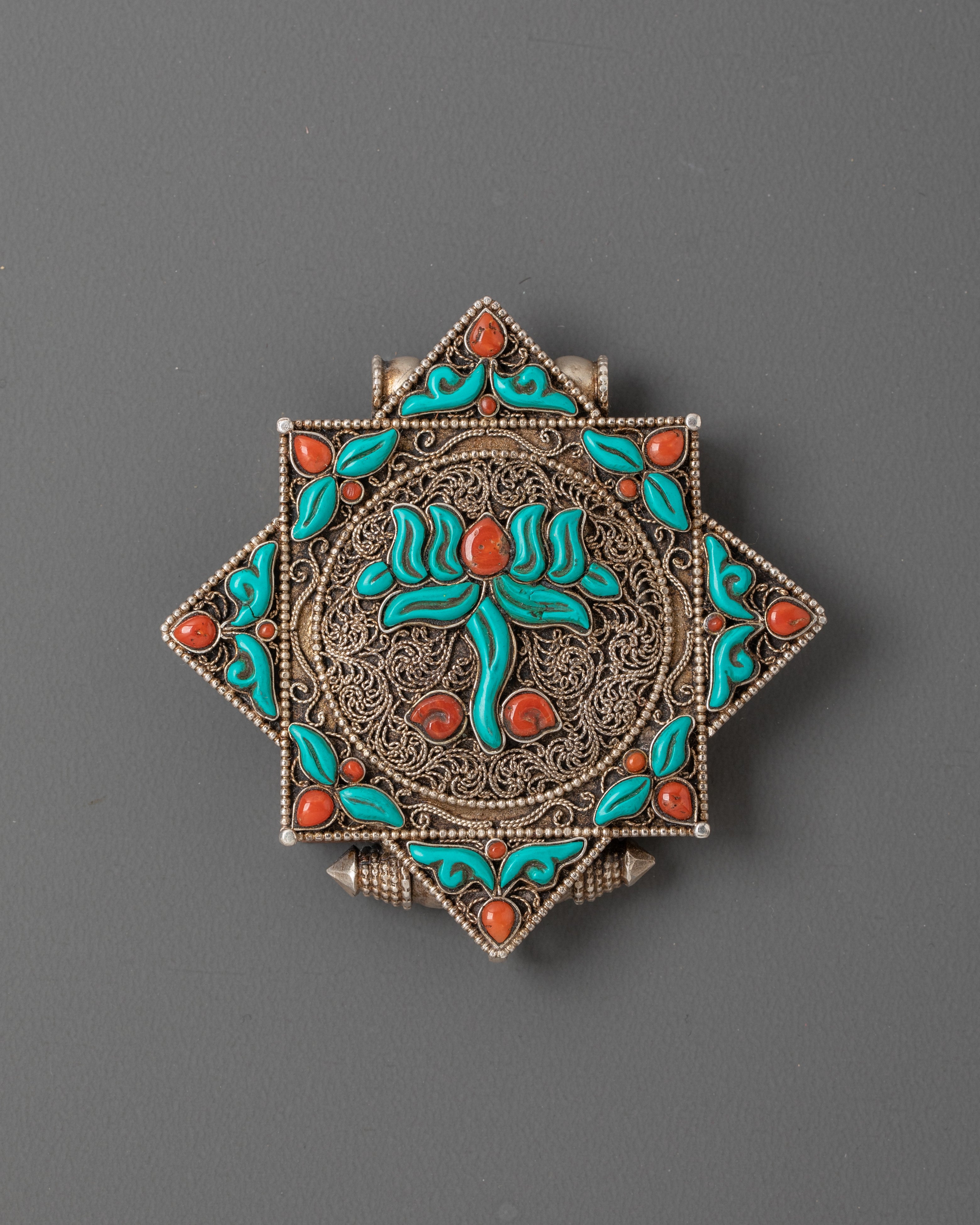 This sacred lotus Ghau box star design exemplifies the finest traditions of Tibetan Buddhist craftsmanship, measuring 8cm in height and 7.5cm in width with a graceful, lightweight presence of 0.060kg. The eight-pointed star configuration radiates spiritual energy in all directions, symbolizing balance and cosmic harmony. At the heart of this prayer amulet locket lies a magnificent lotus flower rendered in turquoise, its petals unfolding in a cross formation that represents the four immeasurables of Buddhist teaching — loving-kindness, compassion, empathetic joy, and equanimity. The surrounding silver filigree detailing forms intricate spiral motifs symbolizing the endless cycle of life, death, and rebirth. Each point of the star is adorned with alternating turquoise and coral stones, creating a serene balance between the celestial blue of wisdom and the warm red of compassion, framed by elegant beaded borders that enhance its sacred geometry.