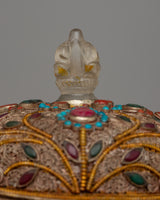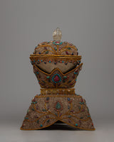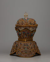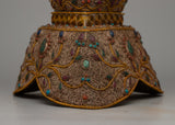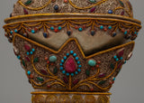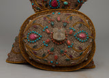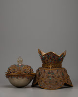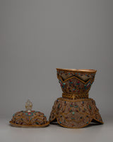 In Tibetan Buddhism, the Sacred Ritual Copper Kapala Set is a potent emblem of ritual offering and spiritual practice. Exquisitely constructed on a copper body and embellished with gemstones and elaborate floral patterns, this ensemble epitomizes grace and reverence. The 24k gold and silver plating amplifies its ceremonial significance and provides a hint of grandeur.