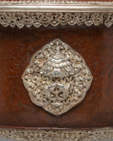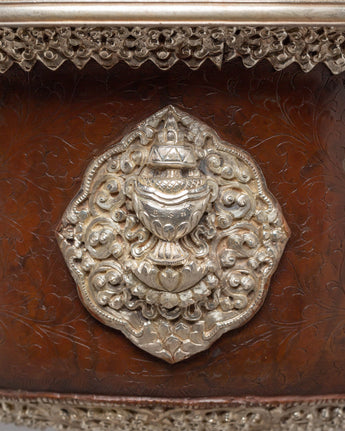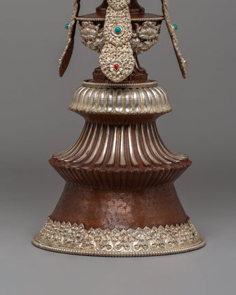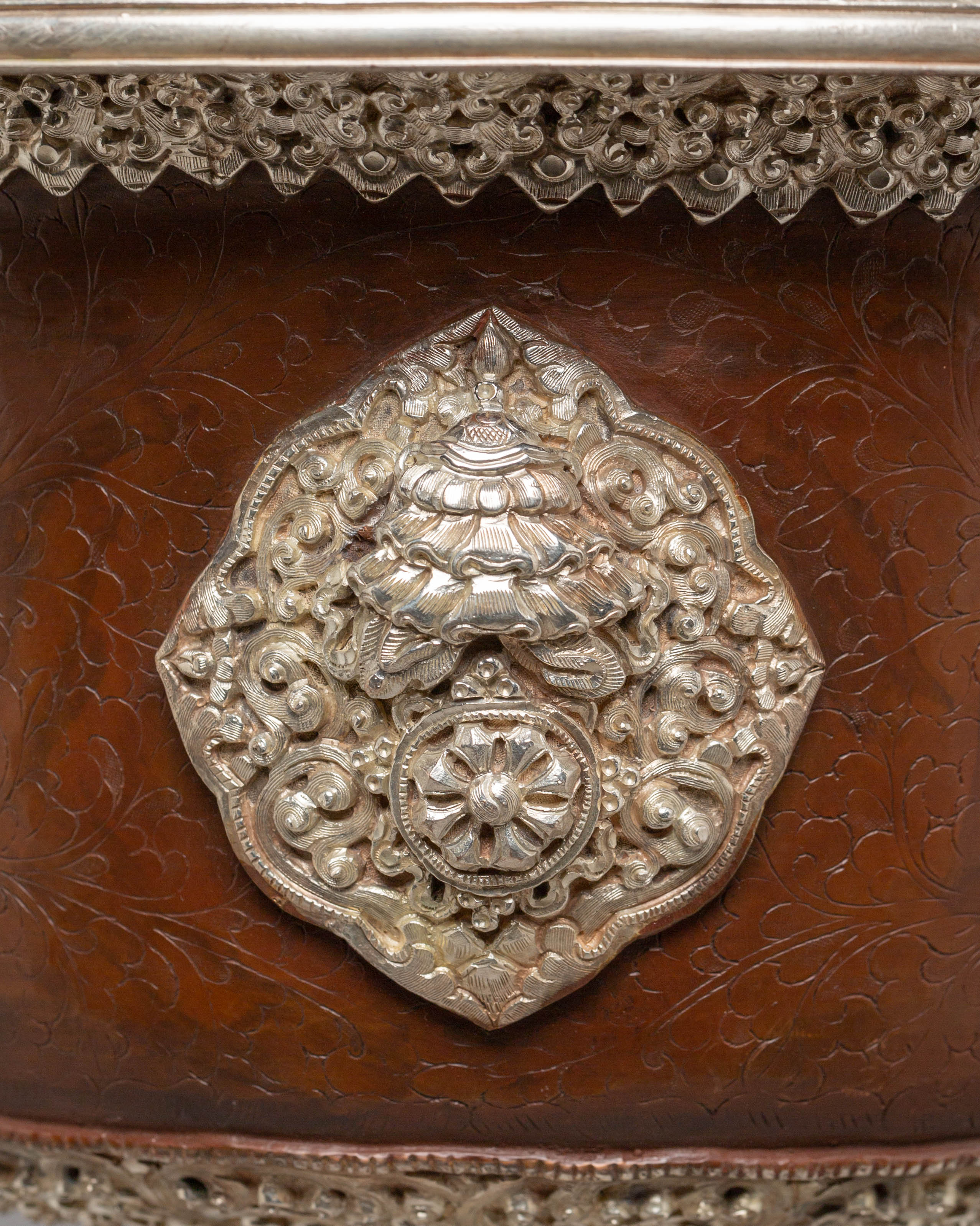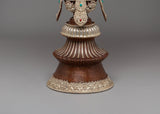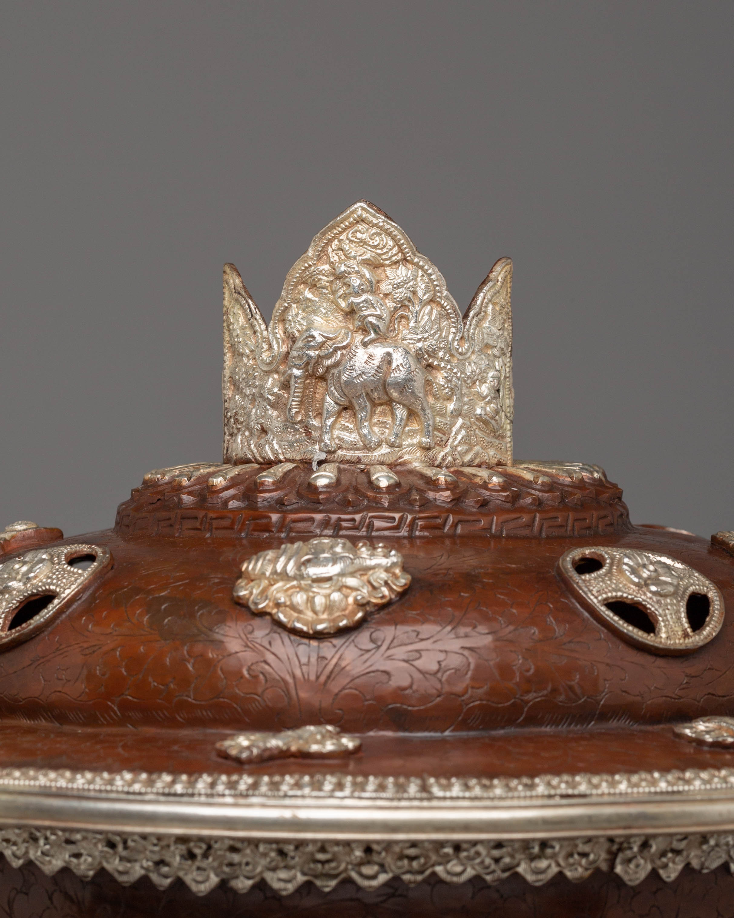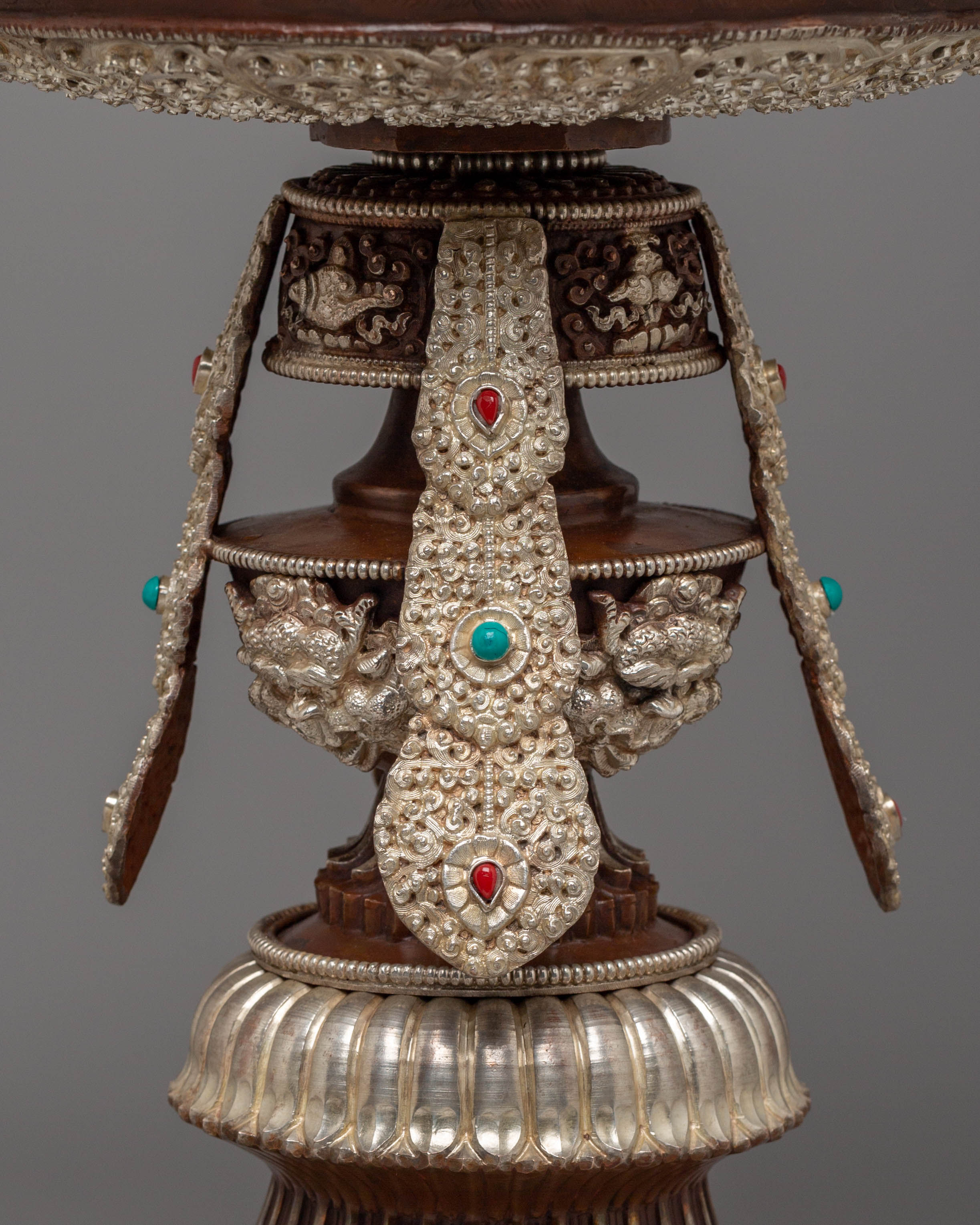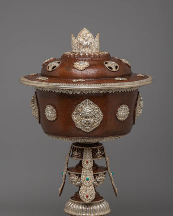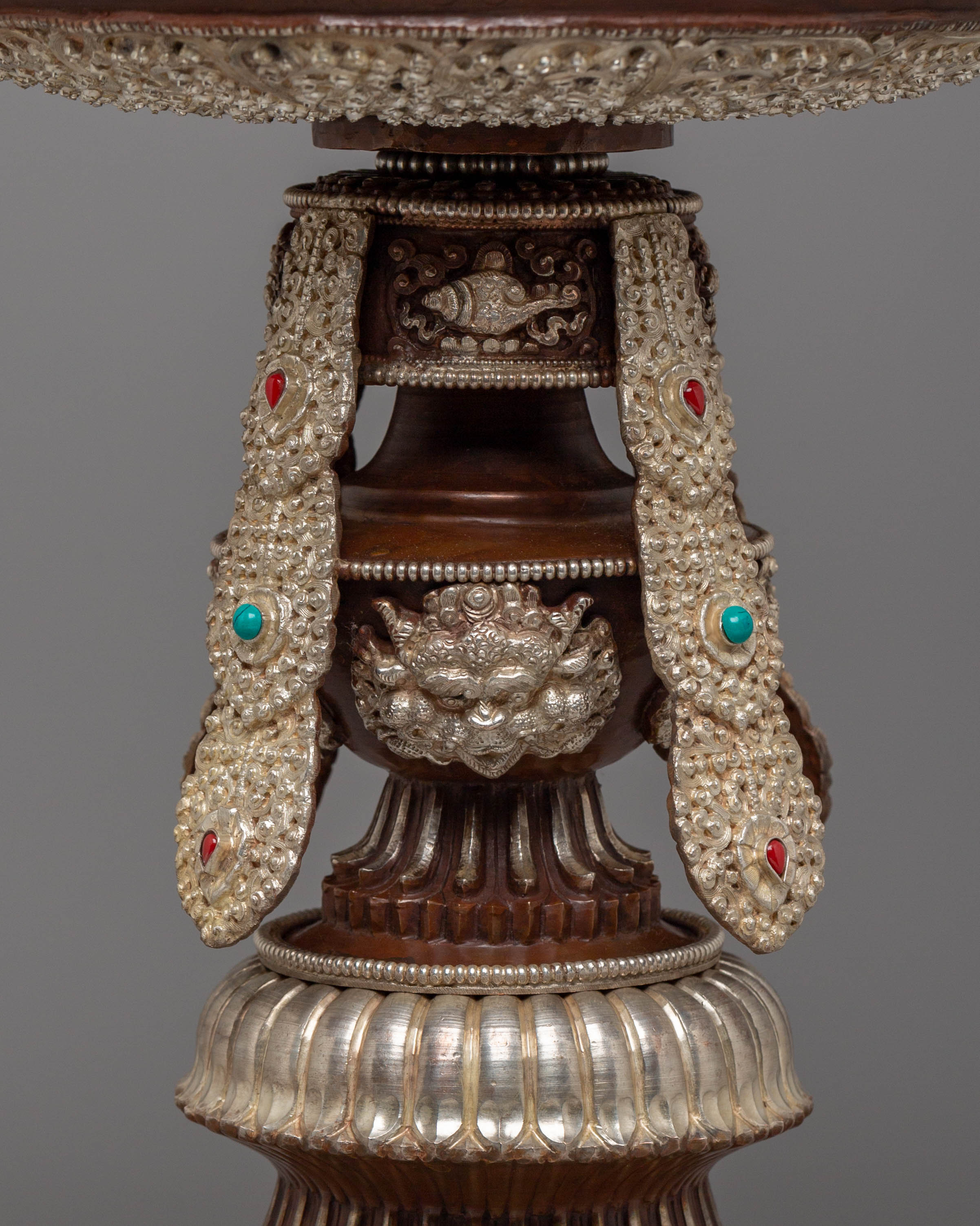 The Tibetan butter lamp, designed with reverence and elegance, is used in Buddhist ceremonies to represent the removal of darkness, the introduction of light into one's life, and the promotion of peace and knowledge. Its gemstone embellishments are meticulously positioned to enhance overall beauty and spiritual potency, transforming this lamp from a beautiful piece into a significant addition to your home temple or meditation space. This lamp is excellent for people looking to deepen their connection to Tibetan spirituality.