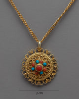 The delicate inlay of turquoise and coral stones, which gives your outfit a pop of color and a hint of the exotic, is what truly distinguishes this locket. A balanced and striking design is achieved by carefully selecting and arranging each stone.