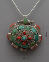 What makes this pendant truly special is the meticulous inlay of turquoise and coral stones. These vibrant gemstones not only add a pop of color but also carry profound symbolic meanings. Turquoise is associated with protection and strength, while coral is believed to bring good luck and ward off negative energy. Wearing this pendant not only enhances your appearance but also connects you with these ancient traditions and the natural world.