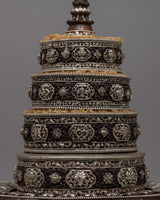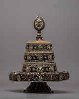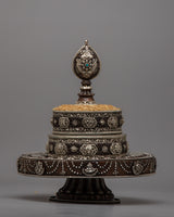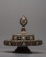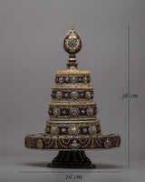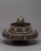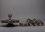 The silver plating makes the set more visually appealing and has a dazzling aura that captivates the senses. This adds a touch of sophistication and refinement. This Mandala Set is a powerful reminder of the endless cycle of life and all beings' connectivity, whether utilized in holy rituals and ceremonies or exhibited as a focal point in your home.