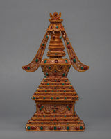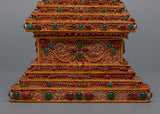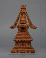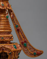 The Buddha Stupa is beautifully hand-carved for the Buddhist Shrine. The stupa is coated with 24K genuine gold. The stones are placed at the stupa. The base of the stupa is a Square. The Green Stone is placed at the top of the jewel and the moon, which makes the stupa very beautiful. At the parasol, the gemstones are hanging around. At the center, you can see the beautiful statue placed.