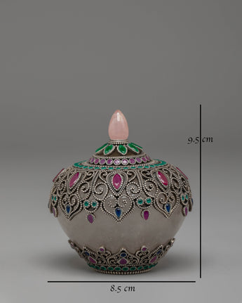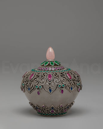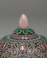 The Spiritual Tibetan Dhupur Rice Pot is a sacred ritual vessel traditionally used for rice offerings in Tibetan Buddhist practices. Crafted from 12 Tola silver, this beautifully detailed pot stands 9.5cm in height and weighs 0.42kg. It features an elegant lid crowned with a rose crystal finial and is adorned with crystal accents, lapis lazuli, and gemstone inlays. In Tibetan rituals, rice symbolizes abundance, purity, and gratitude, making this offering pot an essential element for altar arrangements and ceremonial use.