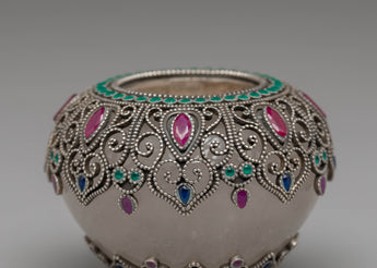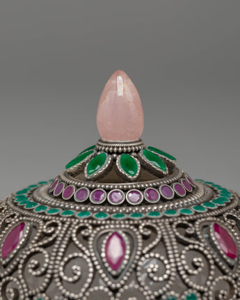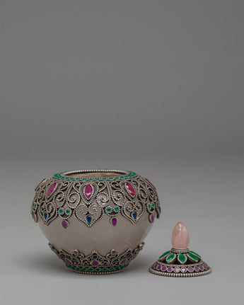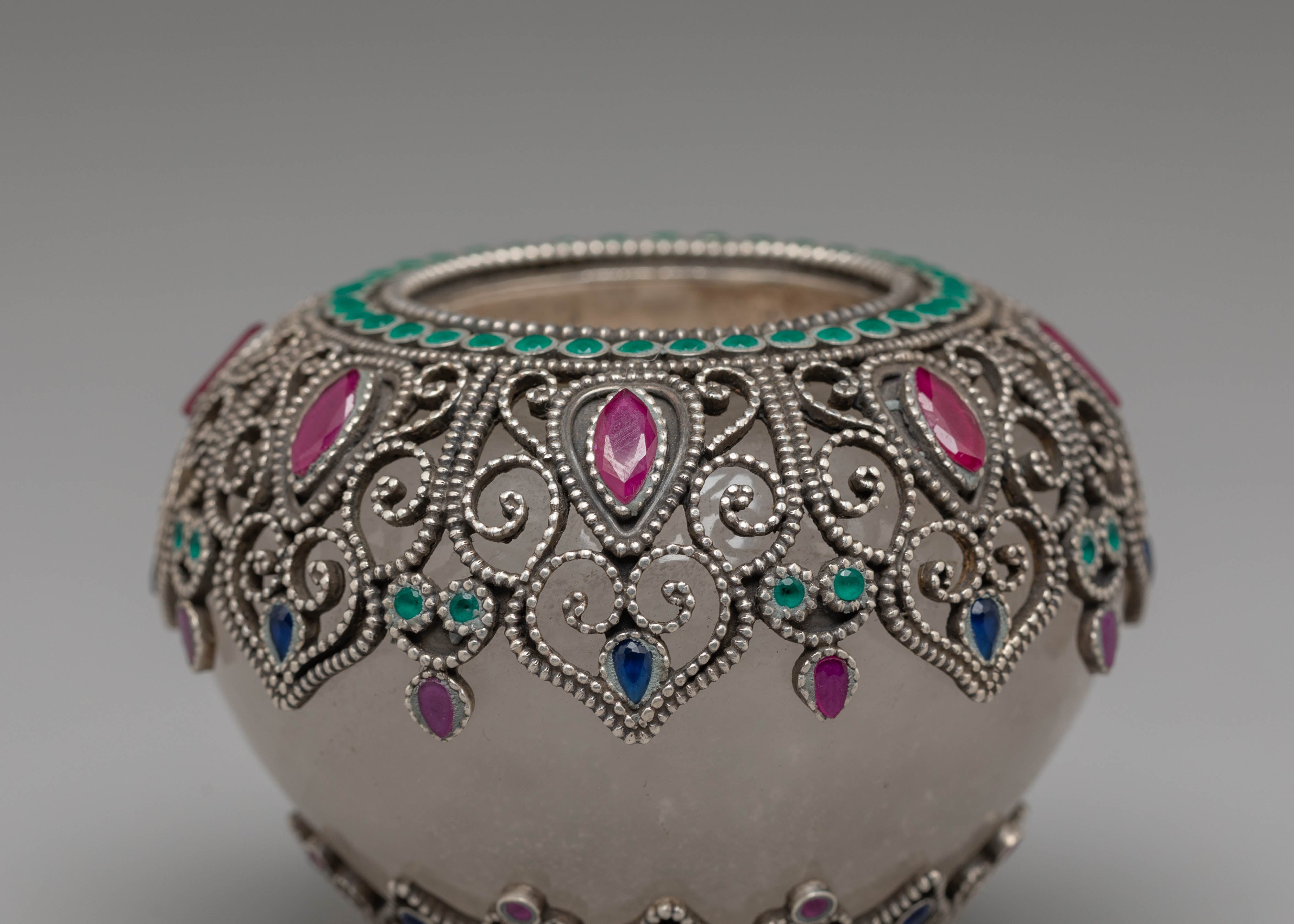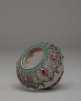 The design of this Tibetan rice pot reflects refined Himalayan craftsmanship and spiritual symbolism. Intricate floral and scroll motifs decorate the silver body, representing prosperity and the unfolding of spiritual intention. Lapis lazuli symbolizes wisdom and truth, while rose crystal is associated with compassion and gentle spiritual energy. Precise crystal details enhance the pot's visual depth, creating a balanced, harmonious appearance suited for sacred spaces and devotional settings.