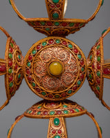 The double vajra or crossed vajra is formed from four lotus-mounted vajra heads that emanate from a central hub towards the four cardinal directions and symbolizes the principle of absolute stability.