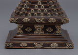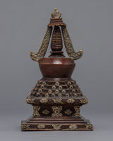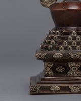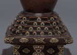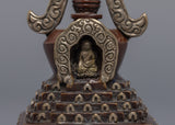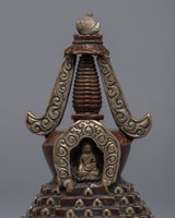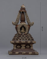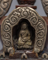 This beautifully crafted Stupa in Buddhism is a handmade masterpiece created with exquisite attention to detail by skilled artisans. Made with a Silver plated finish, it features an intricately designed statue that is crafted onto the bumpa. The stupa symbolizes enlightenment and peace, and its elegant design and silver finish make it an excellent addition to any home or meditation space. The statue on the bhumpa adds an extra layer of spiritual significance to this already remarkable piece. This stupa is a perfect way to bring a sense of calm and tranquility to any environment.