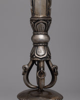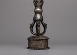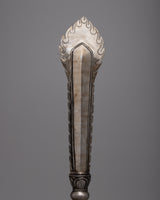 Ritual tools are vital equipment of Tibetan Vajrayana Buddhism practice, meant to dispel misconceptions that obstruct enlightenment. The phurba (Sanskrit: Kila) blade seen here was created to symbolically swallow the three poisons that obstruct spiritual progress: ignorance, greed, and illusion. The Phurba is the physical manifestation of the Vajrakila Buddha, who has the ability to destroy all evil on the earth. Its ceremonial usage is first recorded in the Vajrakilaya Tantra, an eighth-century or older Vajrayana work.