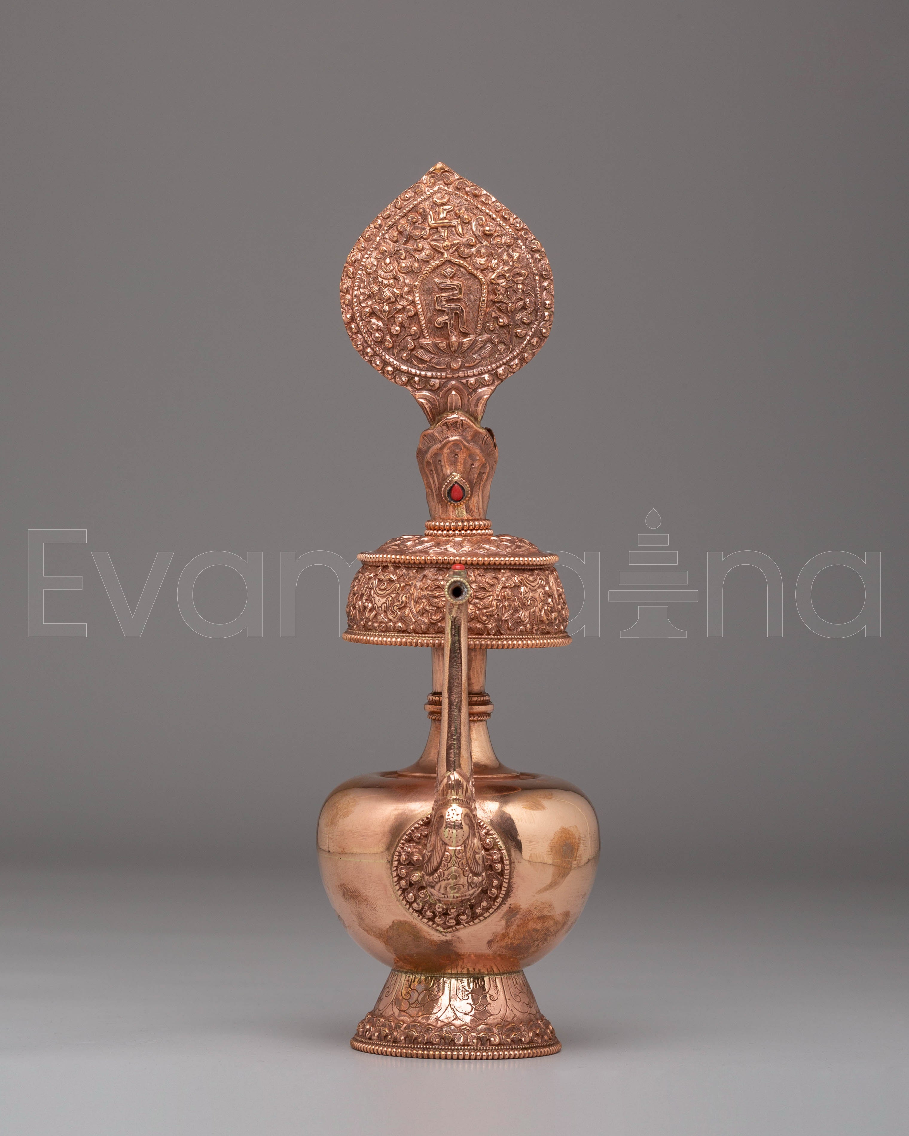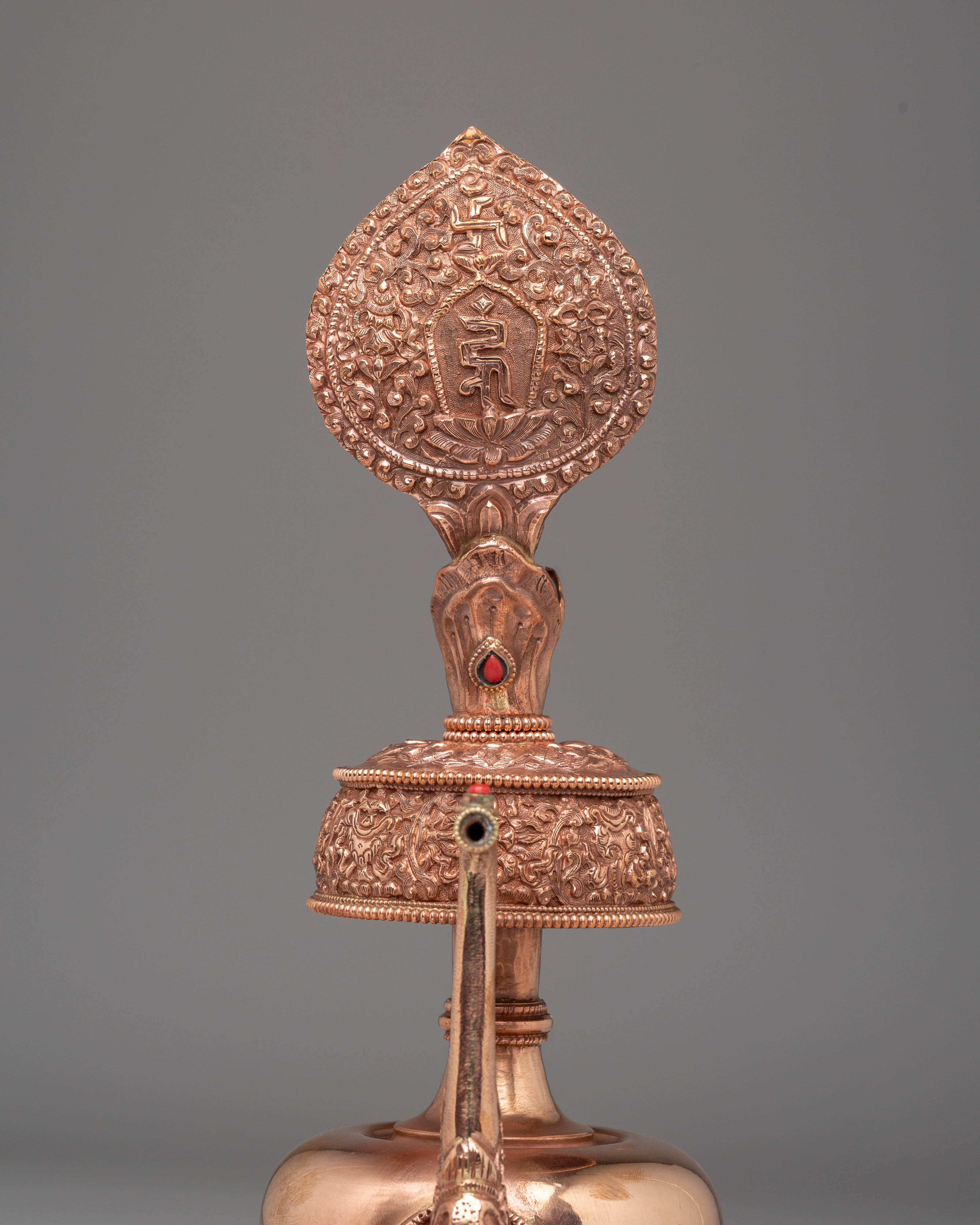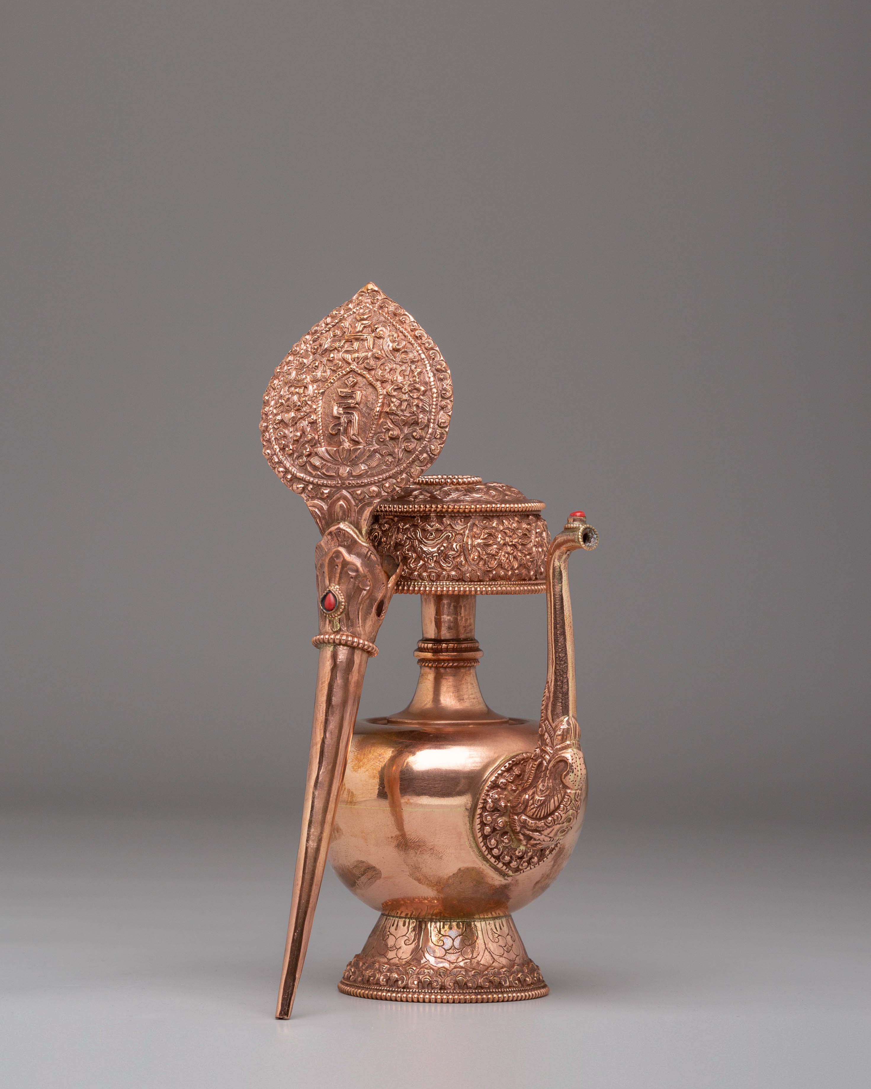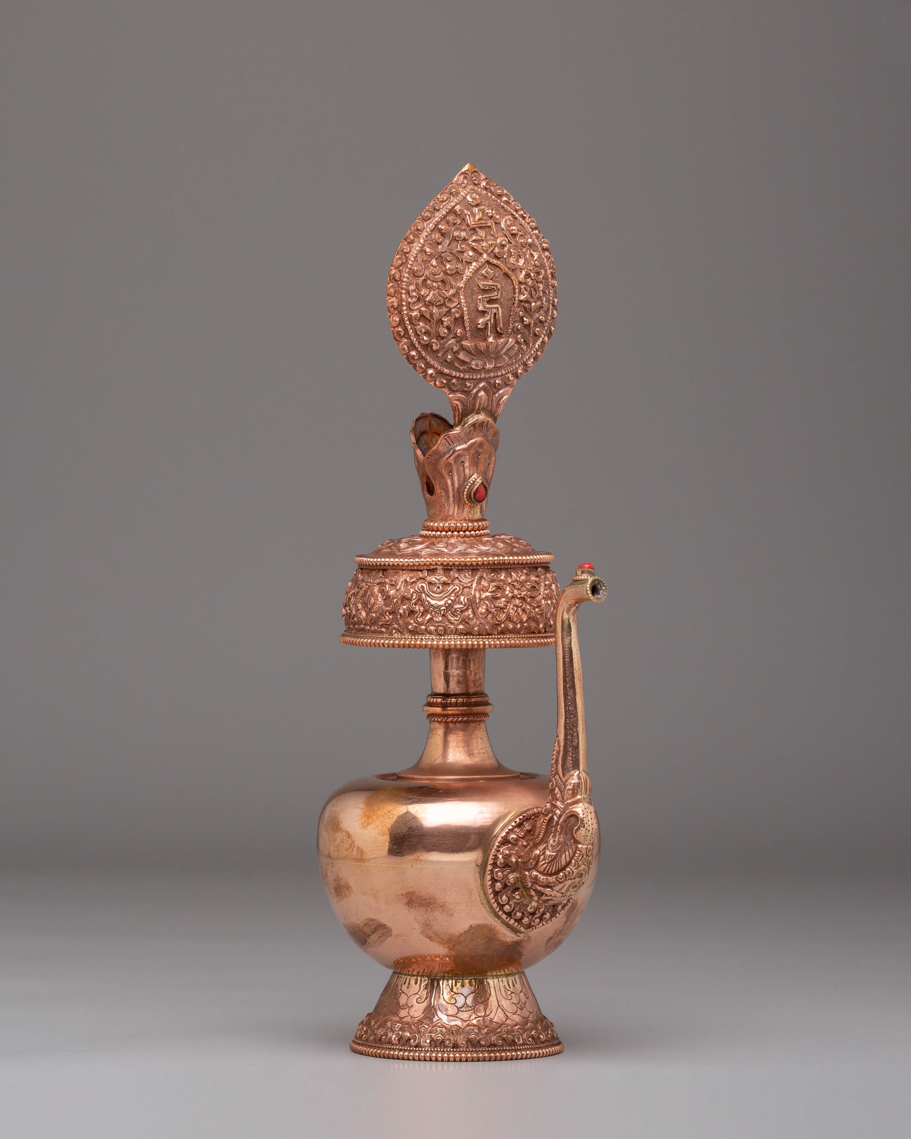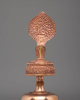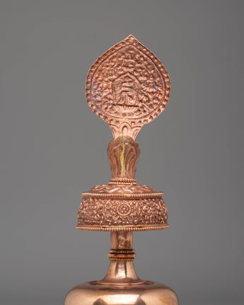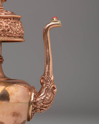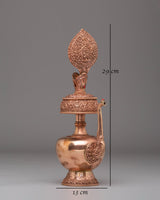The vessel's copper body, embellished with gemstones, enhances its aesthetic appeal and spiritual resonance. Gemstones are believed to possess healing properties and amplify the energy of the offering, elevating the ritual experience. Weighing 0.53 kg, this Bhumba is sturdy and suitable for use in both personal and communal settings, serving as a focal point for prayer and meditation.