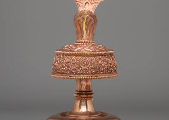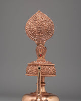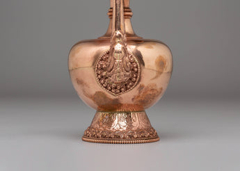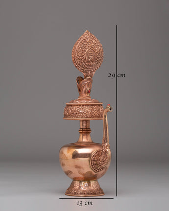 This Tibetan Bhumba Offering Vessel is a beautifully crafted copper vessel adorned with gemstones, symbolizing spiritual purity and devotion. Standing at 29 cm in height and 13 cm in width, it holds significant value in Tibetan Buddhist traditions as a sacred receptacle for offerings during rituals and ceremonies. Its intricate design showcases traditional craftsmanship and attention to detail, making it both a functional vessel and a meaningful piece of spiritual art.
