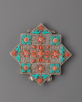 Handcrafted Tibetan Bishwo Vajra Ghau Box Locket | Silver Pendant with Coral & Turquoise Inlay