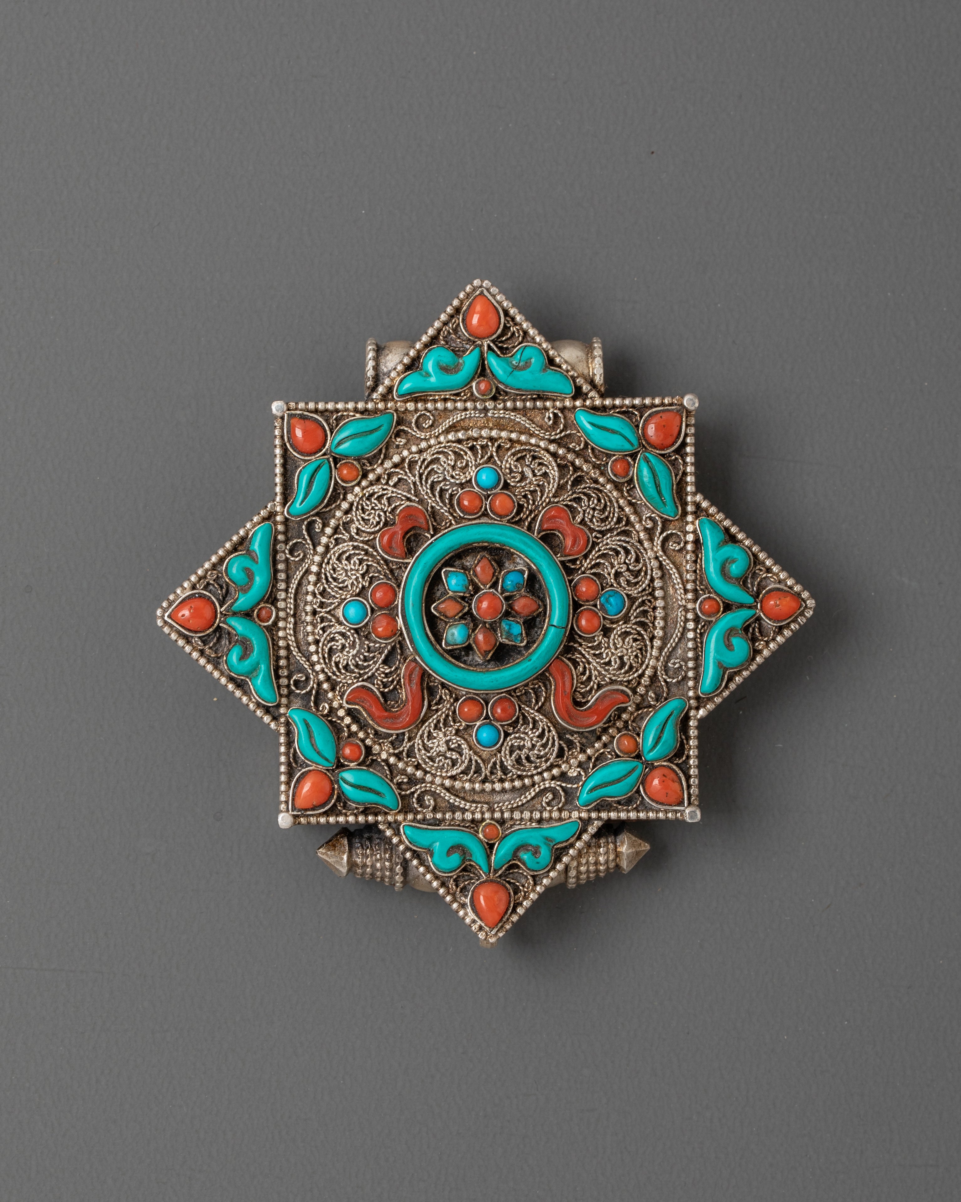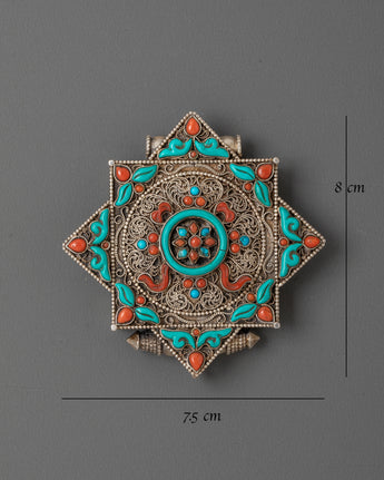 The front of the locket showcases an exquisite mandala-inspired floral motif, surrounded by delicate silver filigree and gemstone inlays. The vibrant coral stones represent life energy and protection, while the turquoise symbolizes peace, healing, and spiritual balance. The symmetrical design not only enhances its aesthetic beauty but also embodies the Buddhist belief in harmony and the unity of all existence.