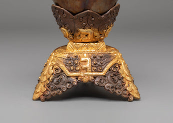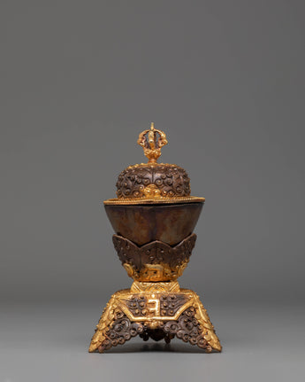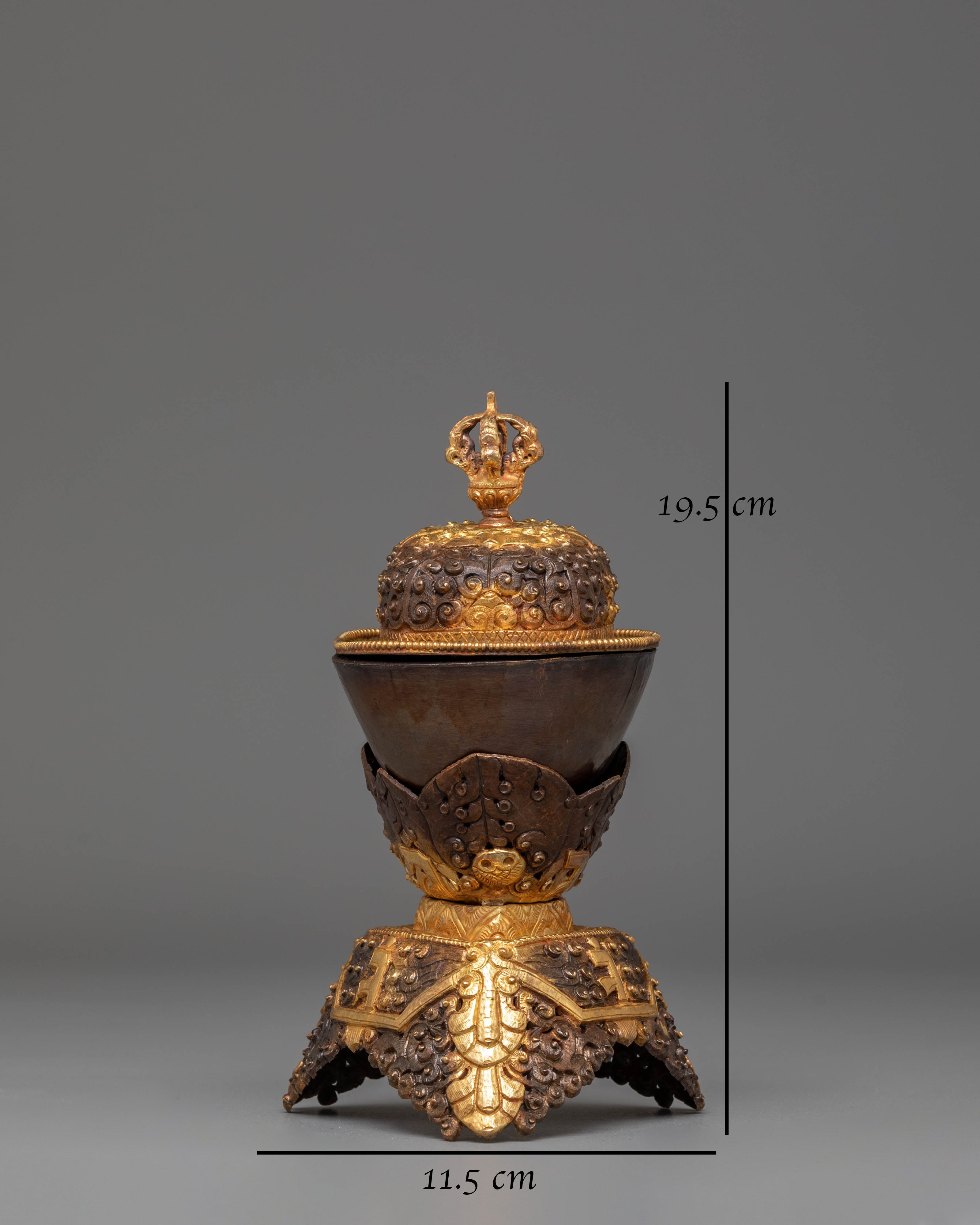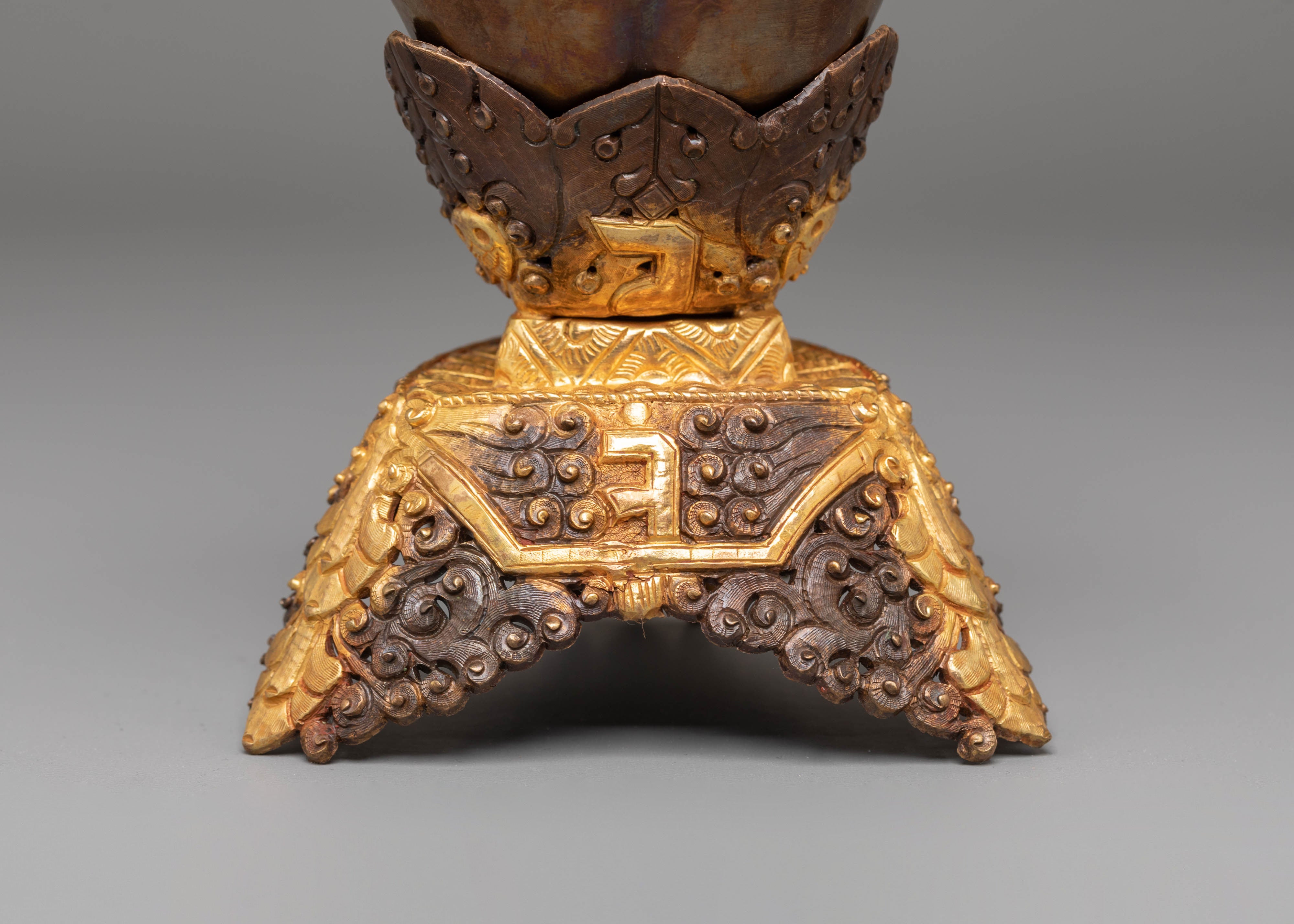 The Kapala features a detailed copper body adorned with gold plating and acrylic color accents, enhancing its beauty and spiritual significance. The bowl is decorated with engraved patterns and sacred motifs, including lotus petals that symbolize purity and spiritual awakening. The gold-plated edges and intricate designs symbolize the enlightenment and divine protection provided by the rituals associated with this vessel. The lid features an ornate top with a golden crown motif, representing spiritual sovereignty and the transcendence of worldly attachments.